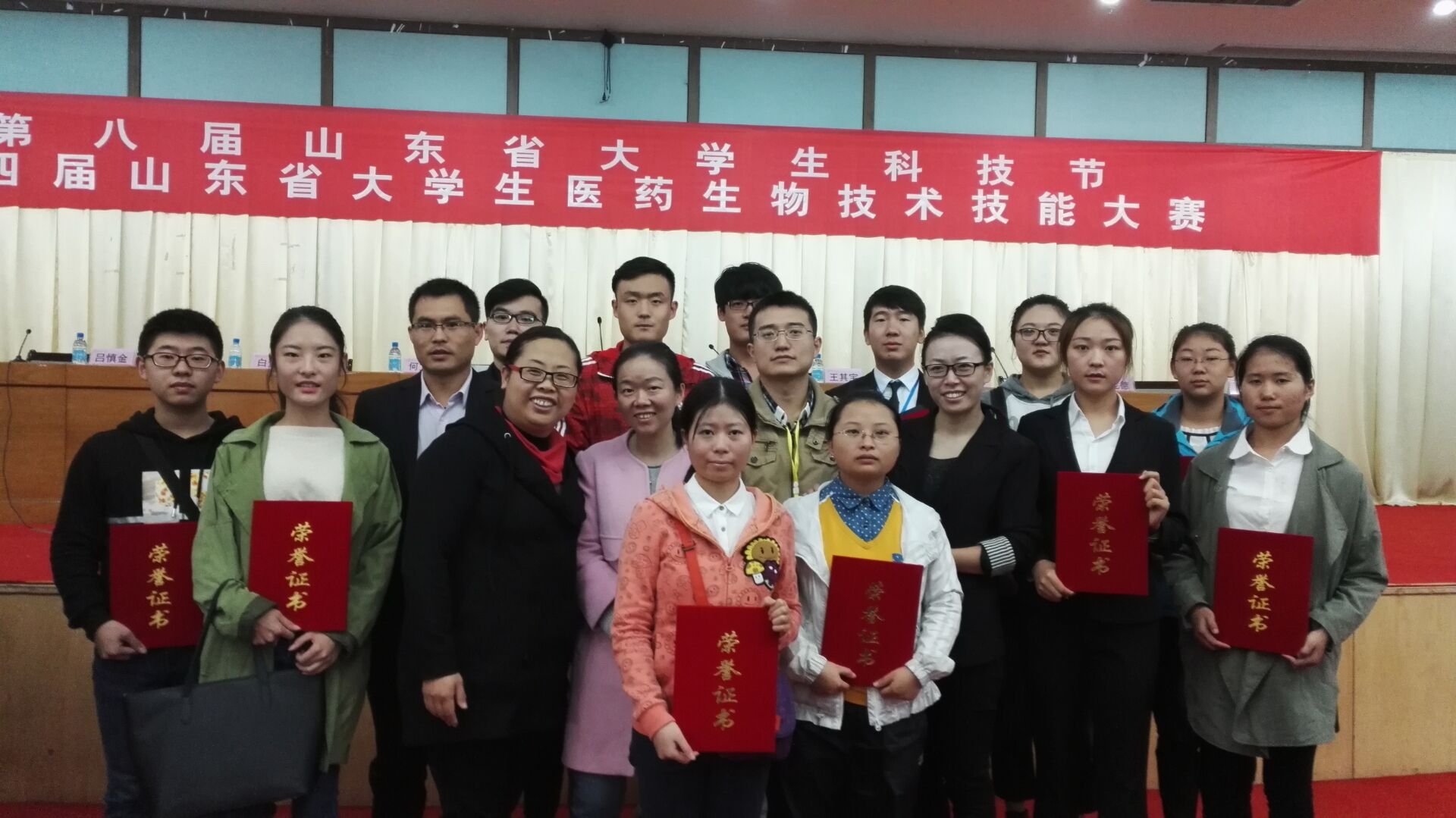 | 10月21日至23日,由山东省科协、省委高校工委、团省委、省教育厅、省发展和改革委员会、省经济和信息化委员会共同主办,山东省免疫学会、山东省医药生物技术学会、临沂市科学技术协会与临沂大学联合承办的“第四届山东省大学生医药生物技术实验技能大赛” 决赛在临沂大学举行。包括我校在内,来自全省12所高校的43个代表队共136名师生参加了本次大赛。本次大赛为期三天,竞赛项目包括医药生物技术实验技能竞赛、创新竞赛和演讲比赛,重点考查学生基本操作和仪器操作的熟练程度、检验实验结果的准确程度、对医药生物技术的认识程度以及语言表达能力。 比赛中,生物科学学院代表队展现出了良好的精神面貌和团队合作精神,凭借扎实的专业知识和实践操作技能、敏捷的思辨能力和较强的表达能力赢得了评委们的一致好评。经过激烈角逐,生物科学学院代表队获得佳绩。由陈祥娥、张玉然老师指导,张然、刘杰、肖文璐同学参赛的项目“一种适用于工业化生产的简便硫酸软骨素提取工艺”获得实验技能竞赛特等奖;由张立涛、朱友双、葛顺老师指导,毕愿坤、关扬、王宇翔同学参赛的项目“硫化物对栉孔扇贝线粒体损伤的影响”获得创新竞赛一等奖;由陈桂玲老师指导,张智博同学参加的项目“肠道微生态与人类健康”获演讲比赛一等奖;另外,我院还获得实验技能竞赛二等奖三项,创新竞赛二等奖三项,演讲比赛二等奖一项。 陈祥娥、张玉然、张立涛、朱友双、葛顺、陈桂玲、徐娜7位老师获优秀指导教师奖,生物科学学院获优秀组织奖。 通过本次技能大赛,不仅检验了生物科学学院的实践教学水平,提高了学生分析问题和解决问题的能力,同时开阔了学生视野,增进了与省内兄弟院校师生间的交流,有助于生物科学学院教育教学改革的深入开展。