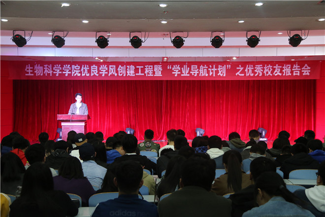 | 4月19日晚,生物科学学院在日照校区一楼多功能厅举办优良学风创建工程暨“学业导航计划”系列活动之优秀校友报告会。生物科学学院师生近300人参加活动。 本次报告会由中国海洋大学李娜、青岛大学陈夏添和山东师范大学刘怡然3名在读研究生重回母校分享成长经验。报告会上,他们分别讲述和分享了自己在母校学习情况和读研学校基本情况及学习体会,从当前生物专业发展前景、就业考研形势、大学生活规划等多个角度,引导同学们正确做人、做事、做学问。报告会现场反响热烈,同学们踊跃提问,就考研学校选择、专业学习等方面的问题进行了深入交流。副院长关晶代表生物科学学院对校友们回校表示热烈欢迎和诚挚感谢,希望校友们以后继续加强与母院的联系,加强交流,助力师弟师妹们成长成才。 此次活动是生物科学学院“学业导航计划”系列活动之一,通过邀请优秀校友回校现身说法,引导同学们明确学习目标、激发学习热情、树立远大抱负,切实有效推进优良学风创建工程。