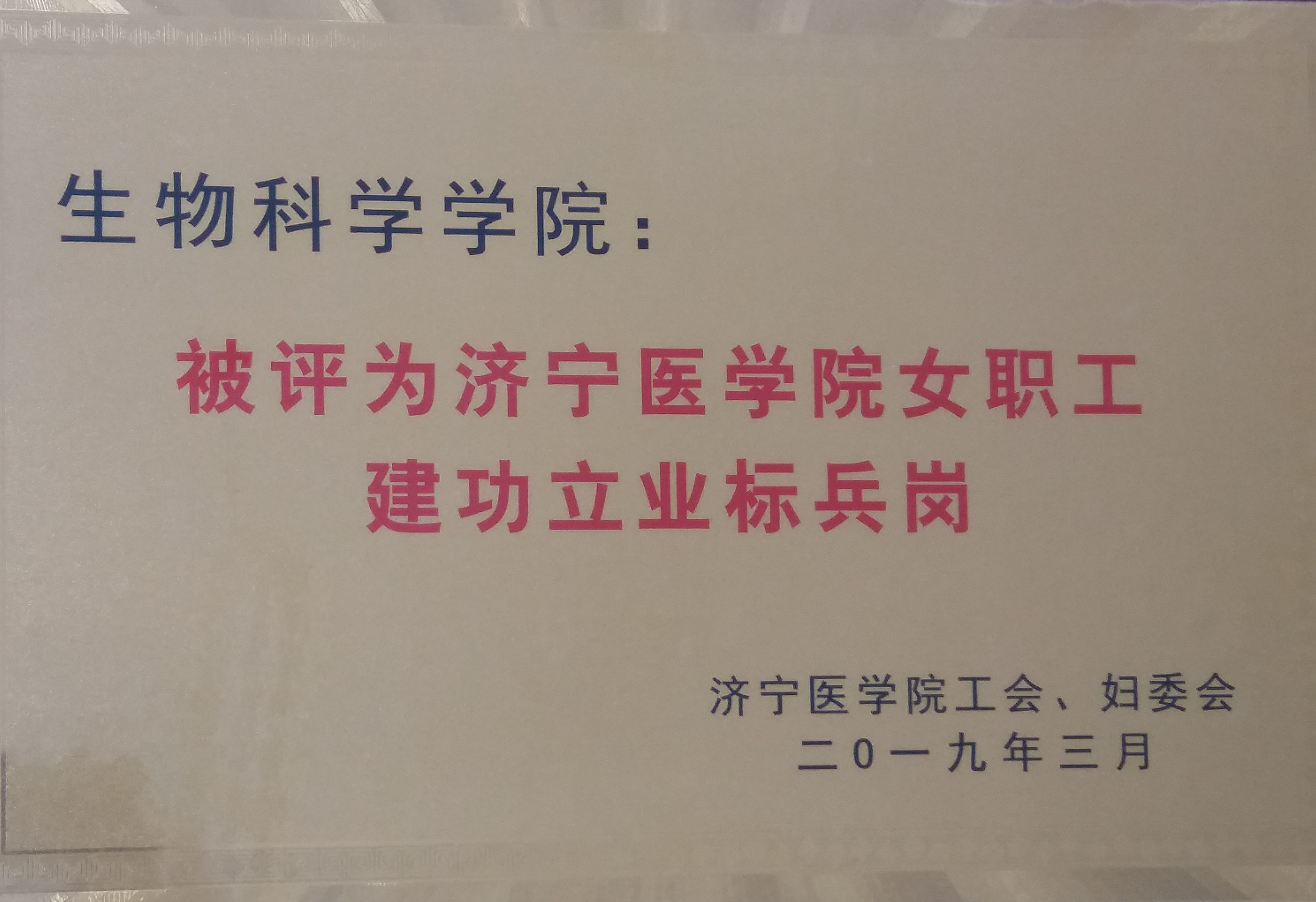 | 近日,中国教育工会济宁医学院委员会发文表彰女职工建功立业先进集体和个人的决定,我院获得“济宁医学院女职工建功立业标兵岗”荣誉称号。 近年来,在学校党委和工会、妇联组织的坚强领导下,生物科学学院分工会认真学习贯彻党的十九大精神,紧紧围绕学校教育教学科研工作,以维护女职工合法权益为主题,以提高全体女职工素质为目标,以岗位建功创优为重点,鼓励广大女职工岗位建功,岗位成才,充分调动女职工积极性、创造性,在学院各项工作中切实顶起了半边天,为学院教育教学科研做出了积极的贡献。 “济宁医学院女职工建功立业标兵岗”荣誉的获得,既是对我院女职工工作的肯定,更是激励。在今后的工作中,我院女职工们将继续发扬优良作风,踏实工作,再接再厉,为学院及学校发展做出积极贡献。