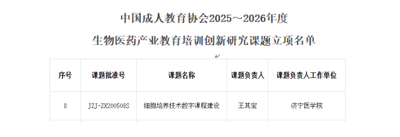 近日,中国成人教育协会公布《中国成人教育协会2025~2026年度生物医药产业教育培训创新研究课题立项通知》,经健康智慧教育专业委员会组织专家评审并报中国成人教育协会审批,我院王其宝教授主持申报的 “细胞培养技术数字课程建设” 课题脱颖而出,成功获批。